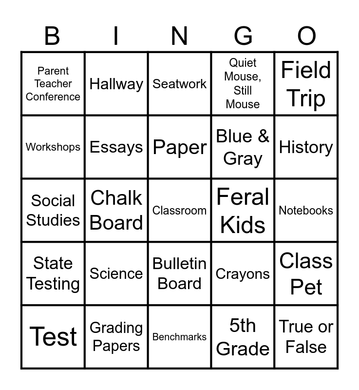 This bingo card has 84 words: Free!, BIC, Seatwork, Ruler, Report Card, Lessons, Southland, Students, Manipulatives, Crazy Parents, Teamwork, Tardy, Essays, Feral Kids, Mustangs, Parent Teacher Conference, Test, Workshops, Rebels, Red & Gray, Multiple Choice, Blue & Gray, Classroom, Good Kids, Chalk Board, White Board, Mrs. Clester, Math, Fall Festival, Desk, Science, Class Parties, Lunchroom, Social Studies, True or False, Attendance Sheet, Benchmarks, Class Rules, History, State Testing, Heads Up, 7-Up, Recess, Bus Duty, Motivation, Best Teacher Ever, Grades, Hallway, Homework, Science Fair, Car Rider Line, Elementary, Crayons, Quiet Mouse, Still Mouse, Pencil, Markers, Glue, Grading Papers, Paper, Tornado Drill, Notebooks, Assigned Seats, Ms. Rosemary, Paddling, Study Hall, Textbook, Assembly, Pep Rally, Concerts, Field Trip, Bell, Class Pet, Mentor, 6th Grade, Eraser, Bulletin Board, 5th Grade, Decorated Door, Long Hallways, Rockets, 4th Grade, Books, Positive Reinforcement, Rubric and Fire Drill.