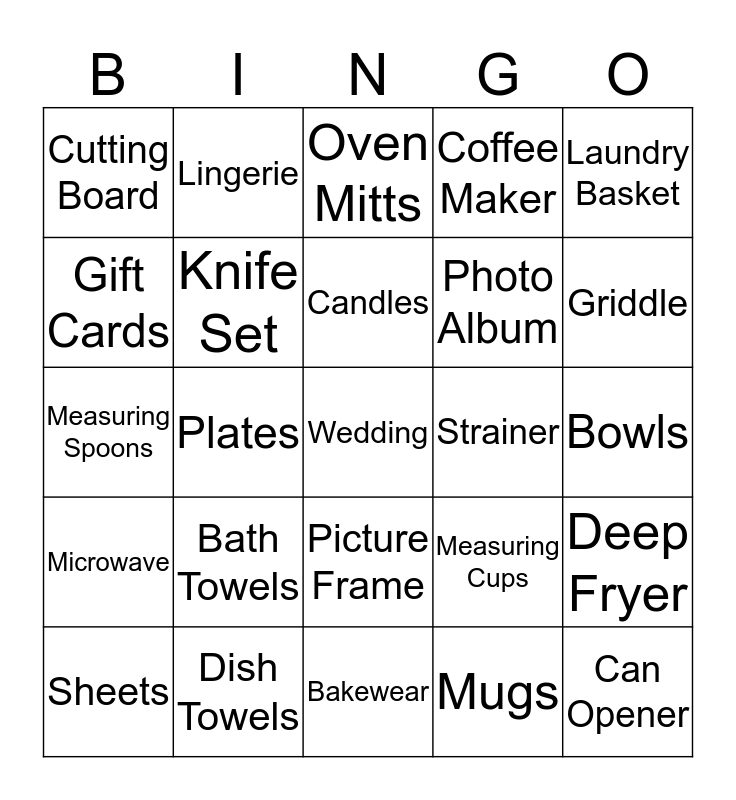 This bingo card has a free space and 24 words: Bath Towels, Dish Towels, Candles, Sheets, Laundry Basket, Cutting Board, Gift Cards, Lingerie, Strainer, Picture Frame, Photo Album, Measuring Spoons, Measuring Cups, Deep Fryer, Knife Set, Mugs, Bowls, Oven Mitts, Griddle, Plates, Can Opener, Microwave, Coffee Maker and Bakewear.