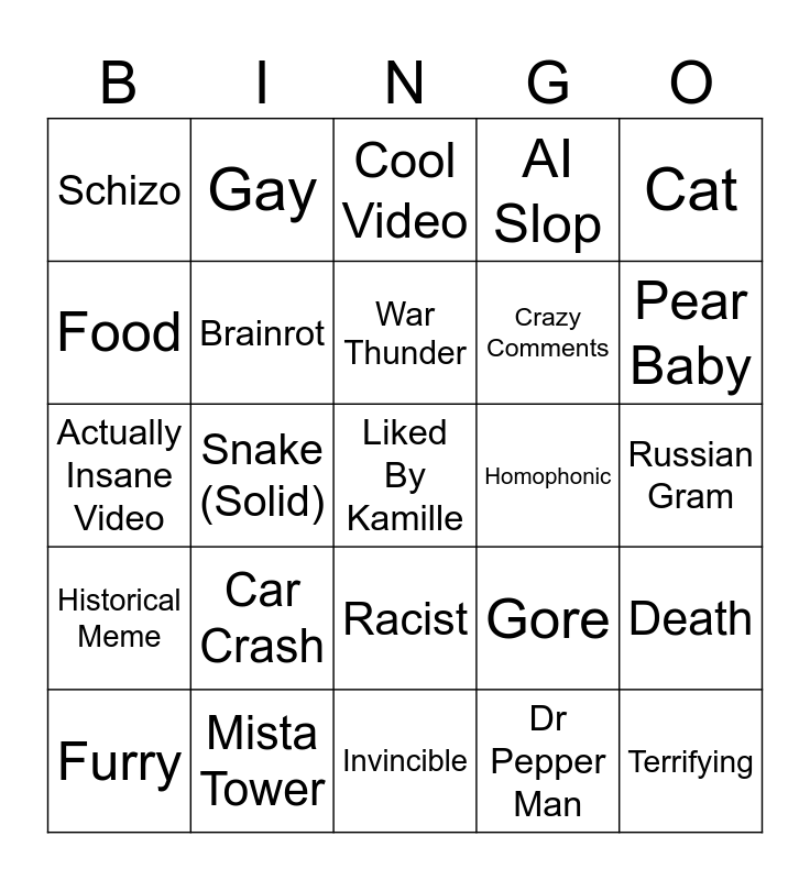 This bingo card has a free space and 24 words: Car Crash, Mista Tower, War Thunder, Furry, Cat, Schizo, Food, Gay, Homophonic, Racist, Crazy Comments, Actually Insane Video, Gore, Death, Brainrot, Dr Pepper Man, Russian Gram, Cool Video, Pear Baby, Snake (Solid), Terrifying, Historical Meme, AI Slop and Invincible.