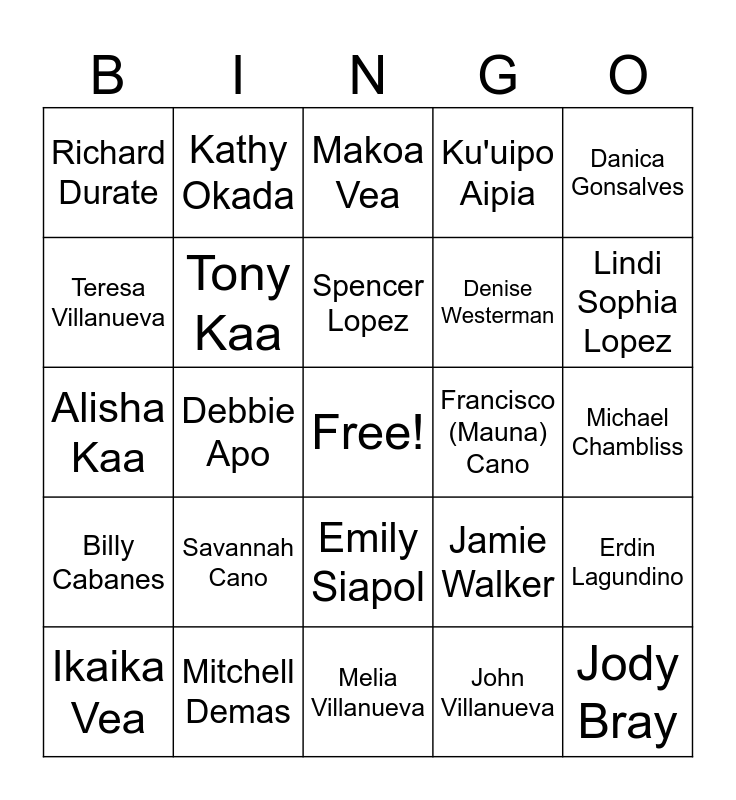This bingo card has a free space and 115 words: Bradley Cano, Brennan Cano, Jason Wandasan, Esty Wandasan, Sam Aipia, Teresa Aipia, Ku'uipo Aipia, Tito Cabanes, Nami Cabanes, Aisha Cabanes, Akito Cabanes, Frank Bully Cano, Judy Cano, Alvin Higashi, Deborah Higashi, Ellison (Eli) Siapol, Emily Siapol, Edwina Simao, Randy Simao, Alisia Vea, Ikaika Vea, Makoa Vea, Gideon Siapol, Rosslyn Siapol, Nathaniel Simao, Billy Cabanes, Mitchell Demas, Yolanda Demas, Scott Lopez, Shayna Lopez, Lindi Sophia Lopez, Spencer Lopez, Debbie Apo, Earl Demas, Kathy Dias, Jim Jimenez, Virginia Jimenez, Lee Ann Olores, Sage Olores, Michelle Omura, Aaron Provchy, Camille Provchy, Letitia Rapozo, Tiana Sanchez, Angel Santiago, Lorita Santiago, John Villanueva, Teresa Villanueva, Michael Whitehead, Nicole Whitehead, Lance Ebert, Francisco (Mauna) Cano, Jacquelyn (Pomai) Cano, Keahi Cano, Kinohi Cano, Franchot Hawaiian Cano, Pamai Cano, Jade Casmass, Elly Ebert, Ferdinand Lagundino, Erdin Lagundino, Beverly Lavens, Tawnya McMurray, Austin McMurray, Napua Niau, Rose Nordmeier, Ariyah Villanueva, Tony Kaa, Alisha Kaa, Kuena Kaa, Michael Chambliss, Lincoln Chambliss, Logan Chambliss, Caity Chambliss, Bob Bray, Jody Bray, Savannah Cano, Richard Durate, Leilani Duarte, Lionel Hoapili, Samantha Hoapili, Kathy Okada, Shirley Tamura, Jamie Walker, Denise Westerman, Mark Kaufman, Saige Cano, Keale Rull, Naiona Driver, Remi Driver, Kiani Driver, Isaiah Driver, Jacqueline Bernaldes, Eila Bernaldes, Danica Gonsalves, Kevin Gonsalves, Moani Keala, Abby Keala, Amber Martinez, Pearce Martinez, Kanyon Mattos, Chloe Mattos, Levi Nerpio, Nani Nerpio, Lehua Nerpio, Pohaku Nerpio, Tawai Rull, Ezekiel Villanueva, Melia Villanueva, Sofia Villanueva, Trenton Whitehead, Naiona Leong, Tiare Leong, Tiana Leong and Kewena Leong.