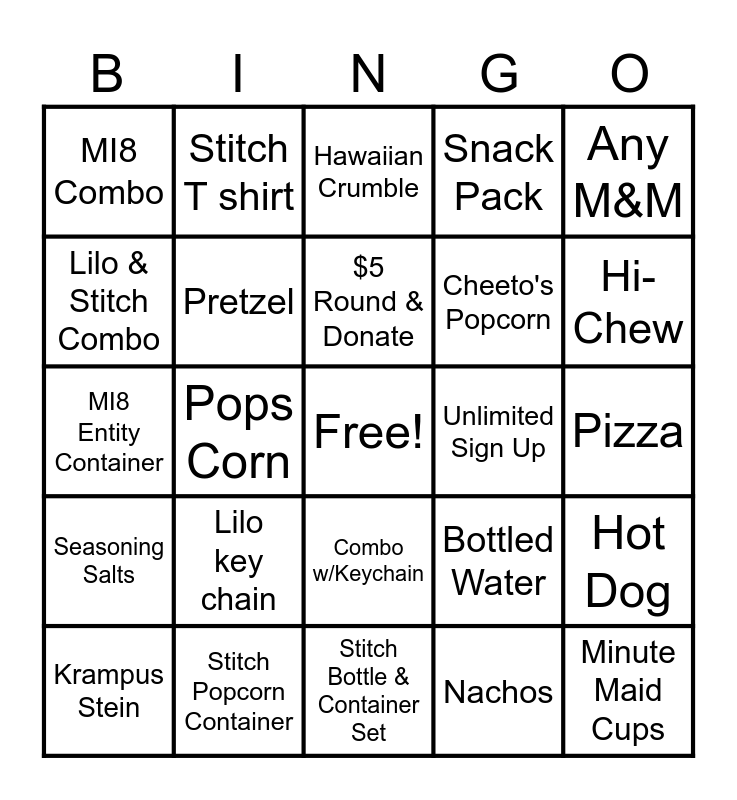 This bingo card has a free space and 24 words: Lilo key chain, Stitch Popcorn Container, $5 Round & Donate, Krampus Stein, Any M&M, MI8 Combo, Lilo & Stitch Combo, Stitch T shirt, Unlimited Sign Up, Combo w/Keychain, Cheeto's Popcorn, MI8 Entity Container, Bottled Water, Hot Dog, Pretzel, Nachos, Pizza, Hawaiian Crumble, Hi-Chew, Pops Corn, Minute Maid Cups, Seasoning Salts, Snack Pack and Stitch Bottle & Container Set.