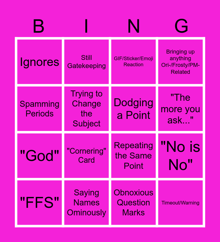 This bingo card has 16 words: Saying Names Ominously, "No is No", GIF/Sticker/Emoji Reaction, Ignores, "God", Still Gatekeeping, Repeating the Same Point, Obnoxious Question Marks, Spamming Periods, Trying to Change the Subject, "FFS", Bringing up anything Ori-/Frosty/PM-Related, "Cornering" Card, "The more you ask...", Dodging a Point and Timeout/Warning.