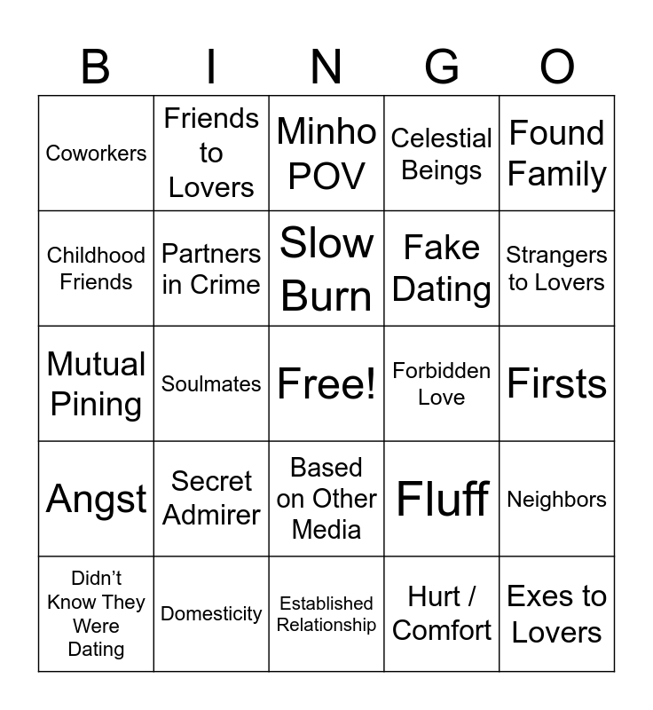 This bingo card has a free space and 54 words: 3+1 / 5+1 Times, Angst, Angst and Fluff, Animals / Pets, Based on Other Media, Blind Date, Celestial Beings, Chan POV, Childhood Friends, Confessions, Coworkers, Dares, Domesticity, Didn’t Know They Were Dating, Dreams, Established Relationship, Exes to Lovers, Fake Dating, Feelings Realization, Firsts, Fluff, Food / Cooking, Forbidden Love, Found Family, Friends With Benefits, Friends to Lovers, Ghosts / Paranormal, Handholding, Happy Ending, Hurt / Comfort, Idiots in Love, Kidfic, Magic, Marriage of Convenience, Minho POV, Mistaken Identity, Mutual Pining, Neighbors, One Night Stands, Partners in Crime, Pining, Rivals with Benefits, Road Trip, Roommates, Secret Admirer, Sharing a Bed, Sickfic, Slice of Life, Slow Burn, Soulmates, Strangers to Lovers, Supernatural Elements, Time (Travel, Loops, etc.) and Trapped Together.