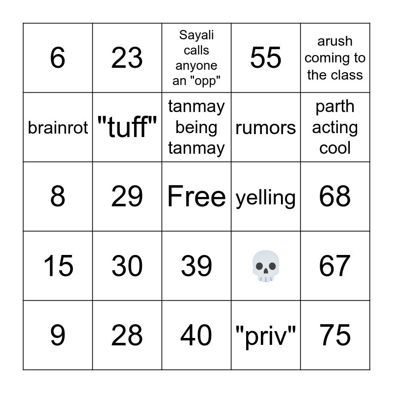 This bingo card has a free space and 75 words: Drama, Spam, Sayali calls anyone an "opp", 999+ useless yapping, racism, Ms. Dailey gets mad at 2 people in front of her desk, sub, sebas being weird, "priv", image leaks, "trade", people stikcers, yelling, parth acting cool, blackmail, "tuff", 🪫, 💀, 🥀, brainrot, sarcasm, tanmay being tanmay, rumors, arush coming to the class, 6, 21, 35, 51, 66, 7, 22, 36, 52, 67, 8, 23, 37, 53, 68, 9, 24, 38, 54, 69, 10, 25, 39, 55, 70, 11, 26, 40, 56, 71, 12, 27, 41, 57, 72, 13, 28, 42, 58, 73, 14, 29, 43, 59, 74, 15, 30, 44, 60, 75 and 45.