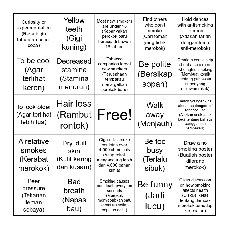 This bingo card has a free space and 24 words: Peer pressure (Tekanan teman sebaya), Dry, dull skin (Kulit kering dan kusam), Tobacco companies target new smokers (Perusahaan tembakau menargetkan perokok baru), Be funny (Jadi lucu), Hold dances with antismoking themes (Adakan tarian dengan tema anti-merokok), Curiosity or experimentation (Rasa ingin tahu atau coba-coba), Yellow teeth (Gigi kuning), Most new smokers are under 18 (Kebanyakan perokok baru berusia di bawah 18 tahun), Walk away (Menjauh), Teach younger kids about the dangers of tobacco use (Ajarkan anak-anak kecil tentang bahaya penggunaan tembakau), To look older (Agar terlihat lebih tua), Decreased stamina (Stamina menurun), Be too busy (Terlalu sibuk), Draw a no smoking poster (Buatlah poster dilarang merokok), To be cool (Agar terlihat keren), Bad breath (Napas bau), Smoking causes one death every ten seconds (Merokok menyebabkan satu kematian setiap sepuluh detik), Find others who don’t smoke (Cari teman yang tidak merokok), Create a comic strip about a superhero who fights smoking (Membuat komik tentang pahlawan super yang melawan rokok), A relative smokes (Kerabat merokok), Hair loss (Rambut rontok), Cigarette smoke contains over 4,000 chemicals (Asap rokok mengandung lebih dari 4.000 bahan kimia), Be polite (Bersikap sopan) and Class discussion on how smoking affects health (Diskusi kelas tentang dampak merokok terhadap kesehatan).