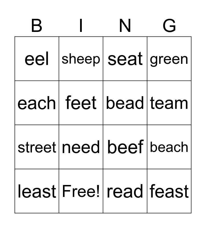 This bingo card has 21 words: Free!, seed, sheep, leak, read, bead, eel, seat, beef, team, street, green, feast, mean, feet, seal, least, need, each, beach and ear.
