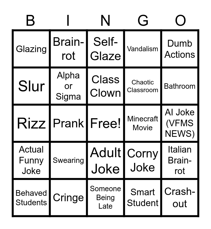 This bingo card has a free space and 24 words: Swearing, Cringe, Class Clown, Behaved Students, Dumb Actions, Glazing, Slur, Brain-rot, Minecraft Movie, Adult Joke, Chaotic Classroom, Rizz, Corny Joke, Italian Brain-rot, Alpha or Sigma, Smart Student, AI Joke (VFMS NEWS), Self-Glaze, Bathroom, Prank, Crash-out, Actual Funny Joke, Vandalism and Someone Being Late.