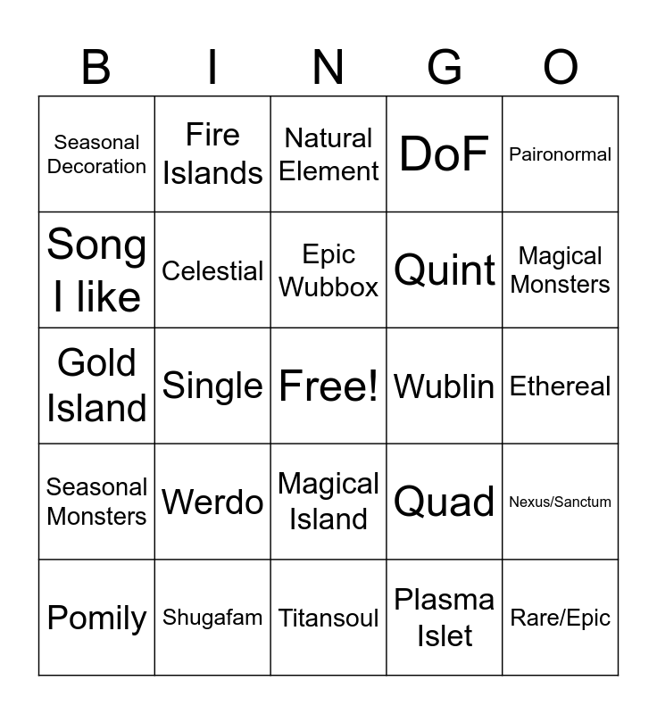 This bingo card has a free space and 24 words: Werdo, Shugafam, Epic Wubbox, Pomily, Paironormal, Seasonal Decoration, Song I like, Fire Islands, Wublin, Magical Island, Quint, Gold Island, Quad, Nexus/Sanctum, Celestial, Plasma Islet, Ethereal, Natural Element, Magical Monsters, Single, Rare/Epic, Seasonal Monsters, DoF and Titansoul.