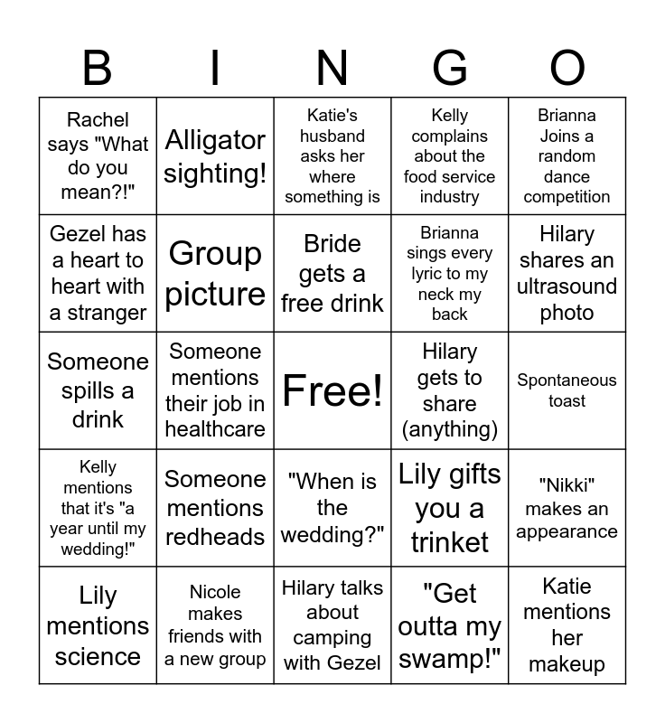 This bingo card has a free space and 26 words: "When is the wedding?", "Get outta my swamp!", Bride gets a free drink, Nicole makes friends with a new group, Brianna Joins a random dance competition, Rachel says "What do you mean?!", Gezel has a heart to heart with a stranger, Alligator sighting!, Spontaneous toast, Lily gifts you a trinket, Brianna sings every lyric to my neck my back, Someone spills a drink, "Nikki" makes an appearance, Lily mentions science, Someone mentions their job in healthcare, Katie's kids call her, Kelly complains about the food service industry, Kelly mentions that it's "a year until my wedding!", Katie's husband asks her where something is, Katie mentions her makeup, Hilary shares an ultrasound photo, Hilary talks about camping with Gezel, Hilary gets to share (anything), Someone mentions redheads, Group picture and Selfie with the bride.