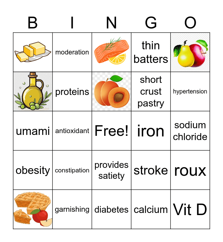 This bingo card has 12 images, a free space and 26 words: water, dietary fibre, malnutrition, proteins, roux, constipation, Vit A, short crust pastry, antioxidant, thin batters, Vit D, sodium chloride, obesity, iron, garnishing, hypertension, coronary heart disease, diabetes, thick batters, healthy skin and eyes, provides satiety, calcium, moderation, stroke, umami and pungent.