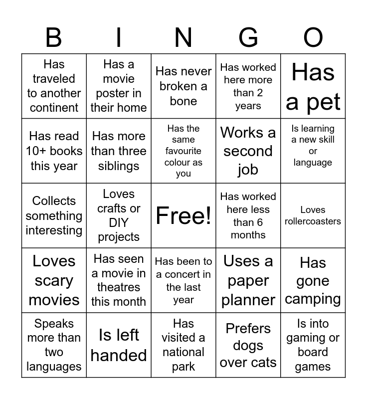 This bingo card has a free space and 24 words: Has seen a movie in theatres this month, Is left handed, Has the same favourite colour as you, Speaks more than two languages, Has a pet, Has traveled to another continent, Has read 10+ books this year, Has a movie poster in their home, Has worked here less than 6 months, Has been to a concert in the last year, Works a second job, Collects something interesting, Uses a paper planner, Has gone camping, Has more than three siblings, Prefers dogs over cats, Loves rollercoasters, Has never broken a bone, Is learning a new skill or language, Loves crafts or DIY projects, Is into gaming or board games, Loves scary movies, Has worked here more than 2 years and Has visited a national park.