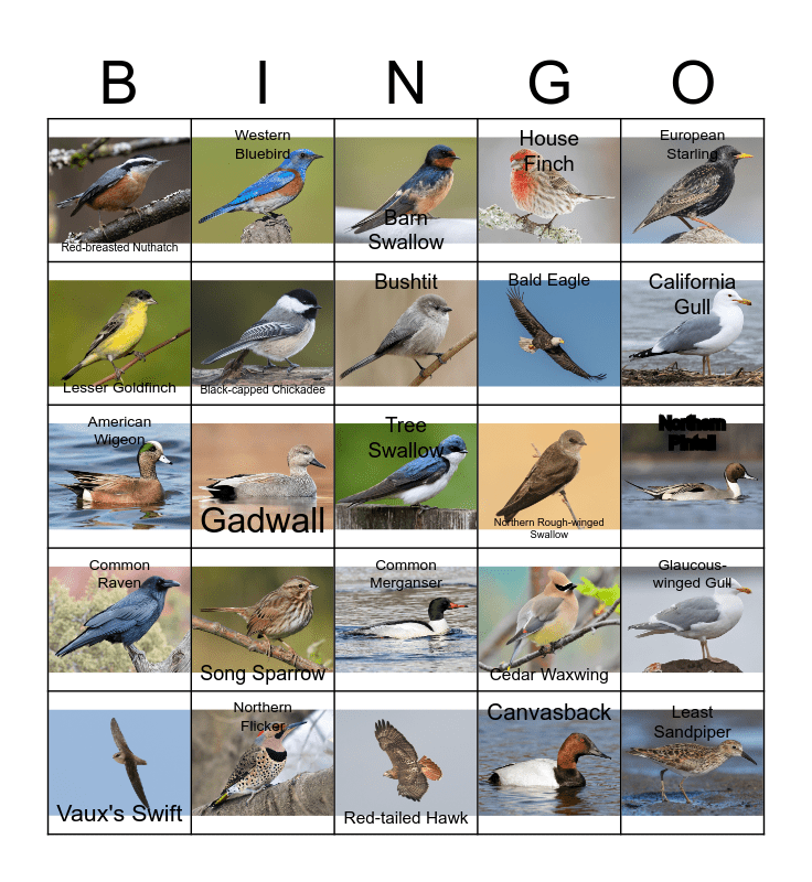 This bingo card has 74 images and 74 words: Sandhill Crane, Cliff Swallow, Barn Swallow, American White Pelican, American Crow, Violet-green Swallow, Western Sandpiper, Yellow-headed Blackbird, Vaux's Swift, Tundra Swan, Canada Goose, Wood Duck, Bushtit, Lesser Goldfinch, Spotted Towhee, Gadwall, Least Sandpiper, California Gull, Yellow-rumped Warbler, American Wigeon, Black-capped Chickadee, Western Bluebird, House Finch, Greater Scaup, Tree Swallow, Bewick's Wren, Wilson's Warbler, Band-tailed Pigeon, Western Wood-Pewee, Pacific Wren, European Starling, American Robin, Dark-eyed Junco, Red-winged Blackbird, Black-headed Grosbeak, Canvasback, Mourning Dove, Greater Yellowlegs, Great Egret, Great Blue Heron, Red-tailed Hawk, Northern Flicker, Western Kingbird, California Scrub-Jay, Purple Martin, Red-breasted Nuthatch, American Goldfinch, Song Sparrow, Yellow Warbler, Western Tanager, Northern Shoveler, Mallard, Northern Pintail, Green-winged Teal, Ring-necked Duck, Lesser Scaup, Common Merganser, Anna's Hummingbird, Killdeer, Glaucous-winged Gull, Bald Eagle, Steller's Jay, Common Raven, Bank Swallow, Northern Rough-winged Swallow, Golden-crowned Kinglet, Brown Creeper, Northern House Wren, Cedar Waxwing, House Sparrow, Pine Siskin, Brown-headed Cowbird, Brewer's Blackbird and Orange-crowned Warbler.