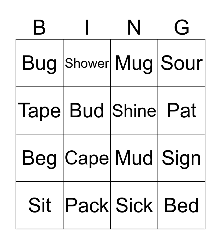 This bingo card has a free space and 15 words: Sit, Bed, Mug, Bug, Pat, Tape, Cape, Sick, Bud, Beg, Sign, Sour, Shine, Shower and Pack.