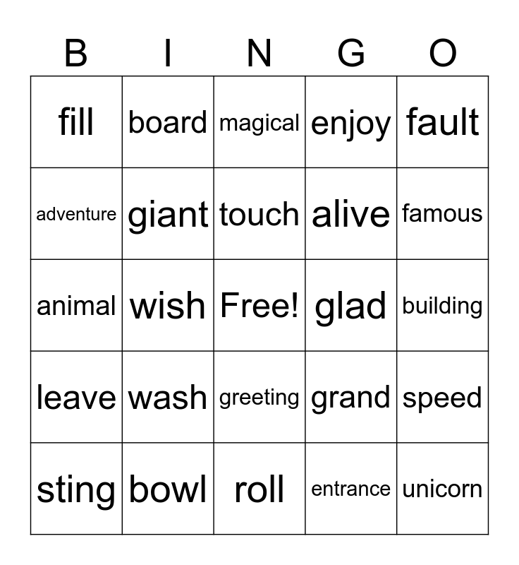This bingo card has a free space and 24 words: wash, bowl, touch, sting, fault, fill, adventure, board, glad, greeting, alive, animal, grand, speed, giant, entrance, building, magical, famous, wish, unicorn, leave, enjoy and roll.