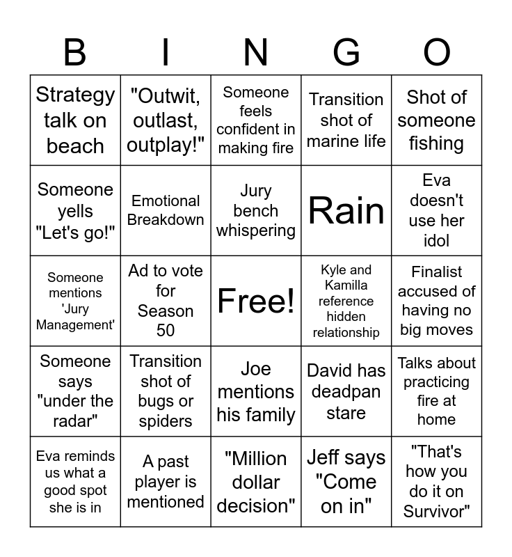 This bingo card has a free space and 24 words: Transition shot of bugs or spiders, A past player is mentioned, Jury bench whispering, Eva reminds us what a good spot she is in, Shot of someone fishing, Strategy talk on beach, Someone yells "Let's go!", "Outwit, outlast, outplay!", Kyle and Kamilla reference hidden relationship, Joe mentions his family, Rain, Someone mentions 'Jury Management', David has deadpan stare, Talks about practicing fire at home, Emotional Breakdown, Jeff says "Come on in", Finalist accused of having no big moves, Someone feels confident in making fire, Eva doesn't use her idol, Ad to vote for Season 50, "That's how you do it on Survivor", Someone says "under the radar", Transition shot of marine life and "Million dollar decision".