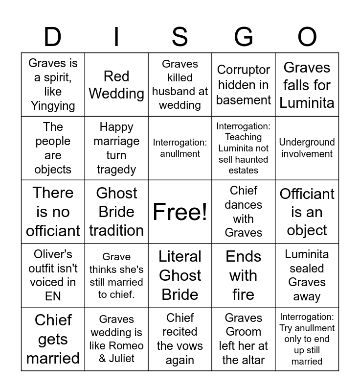 This bingo card has a free space and 24 words: Chief gets married, Grave thinks she's still married to chief., Interrogation: anullment, Graves Groom left her at the altar, Graves falls for Luminita, Graves is a spirit, like Yingying, Red Wedding, Graves killed husband at wedding, Chief dances with Graves, Officiant is an object, There is no officiant, Happy marriage turn tragedy, Ends with fire, Luminita sealed Graves away, The people are objects, Graves wedding is like Romeo & Juliet, Chief recited the vows again, Corruptor hidden in basement, Underground involvement, Oliver's outfit isn't voiced in EN, Ghost Bride tradition, Literal Ghost Bride, Interrogation: Teaching Luminita not sell haunted estates and Interrogation: Try anullment only to end up still married.