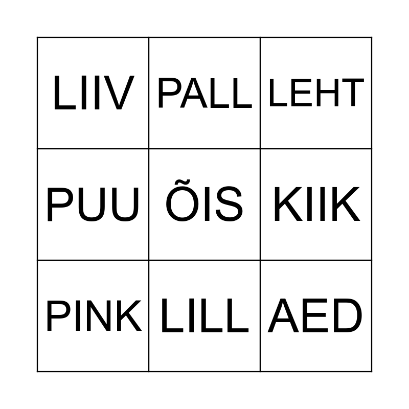 This bingo card has a free space and 8 words: KIIK, LEHT, PALL, PINK, LIIV, AED, PUU and LILL.