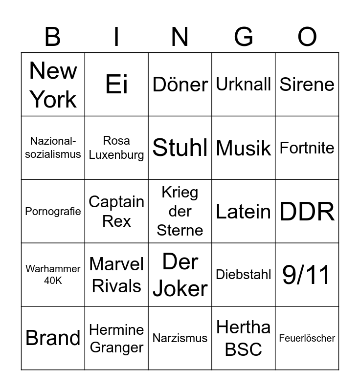 This bingo card has a free space and 24 words: Marvel Rivals, Hermine Granger, Stuhl, Brand, Sirene, New York, Nazional- sozialismus, Ei, Latein, Der Joker, Musik, Pornografie, Diebstahl, 9/11, Rosa Luxenburg, Hertha BSC, DDR, Döner, Fortnite, Captain Rex, Feuerlöscher, Warhammer 40K, Urknall and Narzismus.