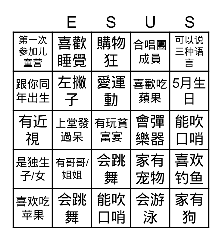 ⚠ This card has duplicate items: 有哥哥/姐姐 (2), 有弟弟/妹妹 (2), 能吹口哨 (2), 左撇子 (2), 喜欢早起 (2), 喜欢吃苹果 (2), 会跳舞 (2), 喜欢吃菜 (2), 可以说三种语言 (2), 喜欢钓鱼 (2), 害怕蟑螂 (2), 喜欢吃辣 (2), 认识耶稣 (2), 不喜欢巧克力 (2), 第一次参加儿童营 (2), 曾经骨折 (2), 家住7楼 (2)