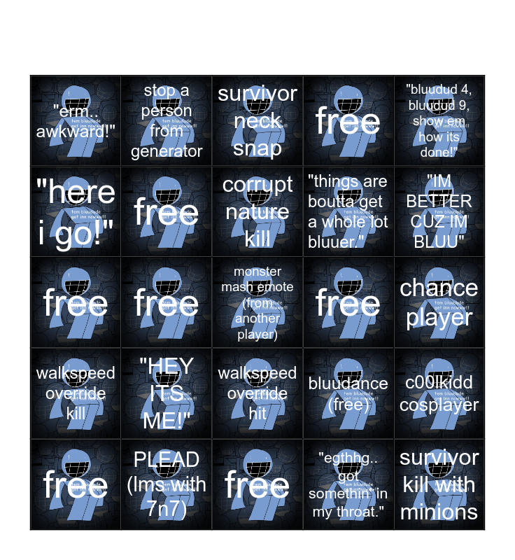 This bingo card has 25 images and 25 words: "HEY ITS ME!", free, corrupt nature kill, free, "bluudud 4, bluudud 9, show em how its done!", "erm.. awkward!", "here i go!", stop a person from generator, free, walkspeed override hit, "things are boutta get a whole lot bluuer.", free, bluudance (free), c00lkidd cosplayer, free, survivor kill with minions, chance player, survivor neck snap, "IM BETTER CUZ IM BLUU", free, monster mash emote (from another player), PLEAD (lms with 7n7), walkspeed override kill, free and "egthhg.. got somethin' in my throat.".