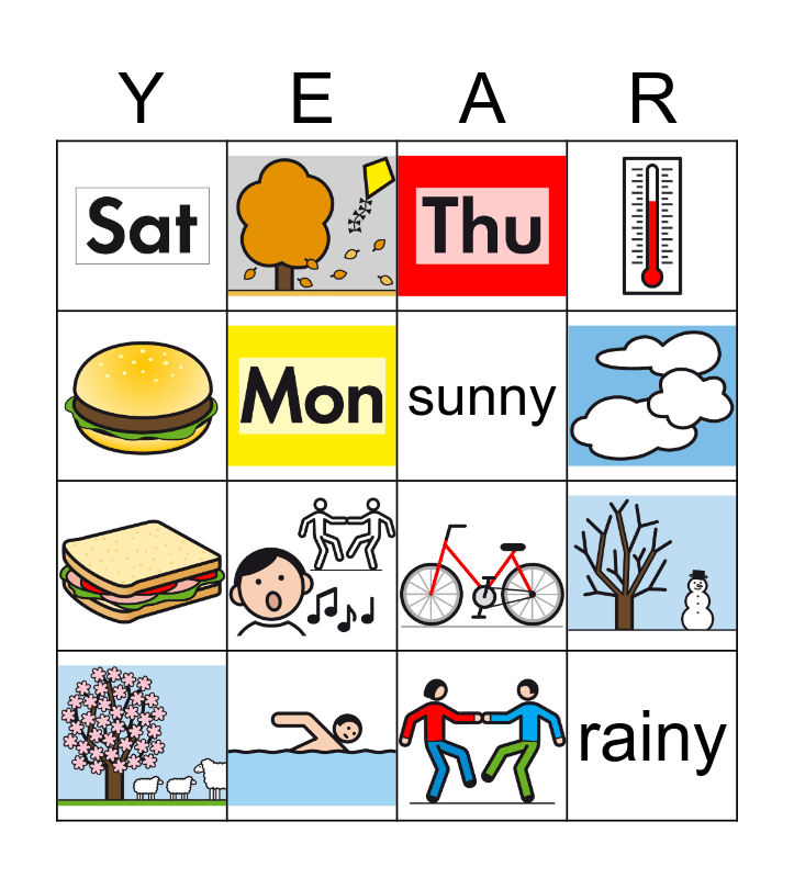This bingo card has 14 images and 2 words: sunny and rainy.