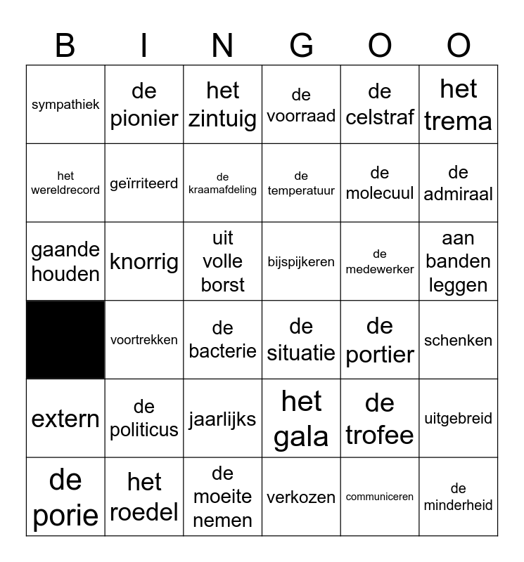 This bingo card has 42 words: Free!, knorrig, het personage, de voorraad, de medewerker, schenken, het wereldrecord, veroveren, het zintuig, de temperatuur, de molecuul, de admiraal, sympathiek, geïrriteerd, de moeite nemen, bijspijkeren, communiceren, aan banden leggen, extern, de pionier, de kraamafdeling, het gala, de portier, het trema, de porie, het roedel, de bacterie, grijnzen, de trofee, de minderheid, het gezinslid, de politicus, uit volle borst, de situatie, het signaal, uitgebreid, gaande houden, voortrekken, jaarlijks, verkozen, de celstraf and het herstel.