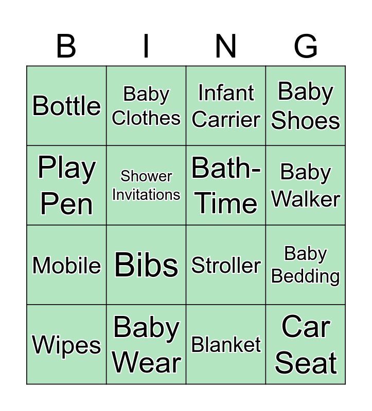 This bingo card has 46 words: Registry, Wipes, Baby Bath, Baby Bottle, Baby Shower Gifts, Baby Carrier, Baby Clothes, Baby Food, Shower Invitations, Baby Jogger, Bath-Time, Baby Shoes, Baby Shower, Baby Sitter, Baby Swing, Baby Toy, Baby Walker, Baby Wear, Baby's Laugh, Play Pen, Baby Bedding, Bassinet, Bottle, Mobile, Lullaby, Bibs, Booties, Bouncer Seat, Cravings, Car Seat, Changing Table, Cloth Diaper, Cradle, Crib, Diapers, Diaper Bag, Blanket, Feeding, Ultrasound, Formula, High Chair, Infant Carrier, Stroller, Baby Smell, Cooing and Baby Shower Games.