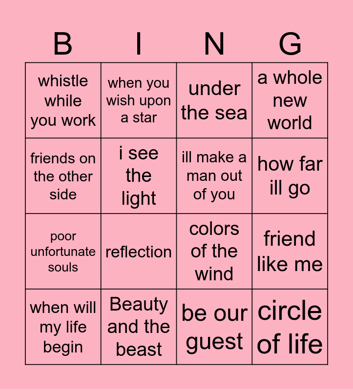 This bingo card has 16 words: Beauty and the beast, friend like me, under the sea, whistle while you work, poor unfortunate souls, when you wish upon a star, colors of the wind, be our guest, friends on the other side, i see the light, when will my life begin, a whole new world, reflection, how far ill go, ill make a man out of you and circle of life.