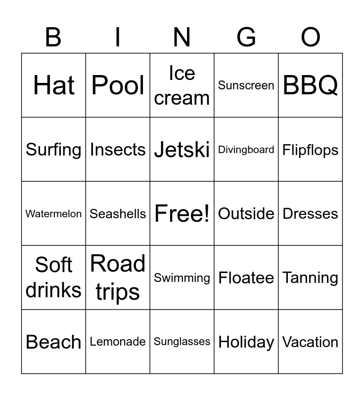 This bingo card has a free space and 44 words: Flowers, Vacation, Warm, Beach, Sun, Holiday, Ice cream, Trampoline, BBQ, Lemonade, Sunscreen, Outside, Swimming, Road trips, Blueberry, Sunglasses, Water, Watermelon, Strawberry, Flipflops, Pool, Ocean, Boat, Hat, Beachball, Dresses, Birthdays, Shorts, Floatee, Soft drinks, Bikini, Tanning, Sunburn, Sprinkler, Seashells, Running, Carnival, Picnic, Jetski, Surfing, Divingboard, Fishing, Insects and Camping.