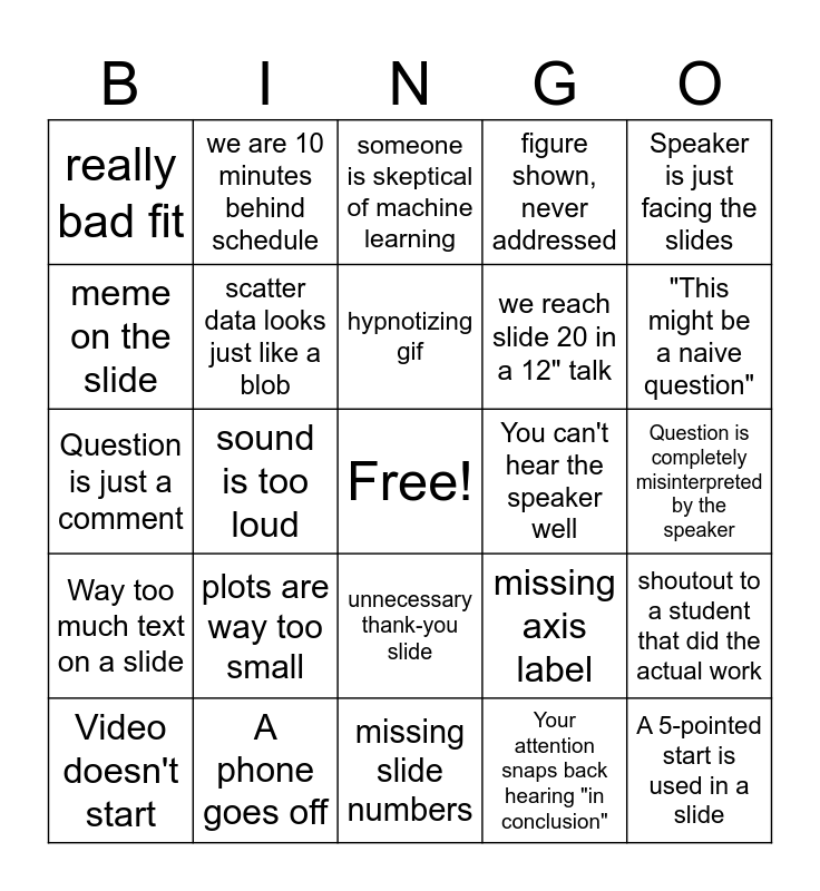 This bingo card has a free space and 30 words: A phone goes off, Unfamiliar jargon, sound is too loud, someone near you disagrees audibly, really bad fit, someone is skeptical of machine learning, scatter data looks just like a blob, unnecessary thank-you slide, You can't hear the speaker well, missing slide numbers, Question is completely misinterpreted by the speaker, A 5-pointed start is used in a slide, Your attention snaps back hearing "in conclusion", someone says: "as you know", but you don't know., "This might be a naive question", "I will come back to that", missing axis label, Way too much text on a slide, plots are way too small, Speaker is just facing the slides, Question is just a comment, Magnetic fields get blamed for a weird observation, we are 10 minutes behind schedule, we reach slide 20 in a 12" talk, meme on the slide, figure shown, never addressed, shoutout to a student that did the actual work, Video doesn't start, hypnotizing gif and content clearly made by AI.