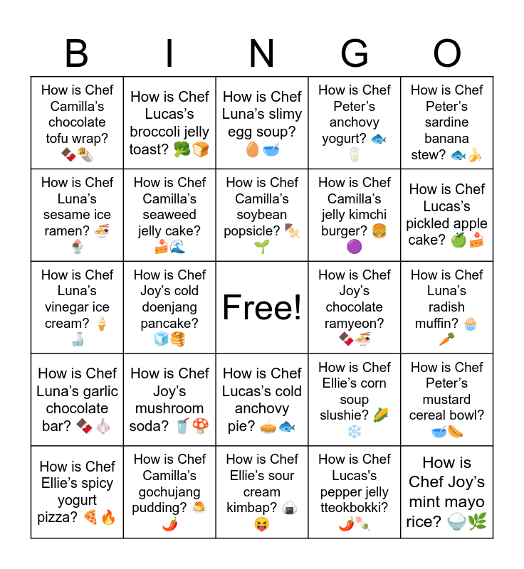 This bingo card has a free space and 34 words: How is Chef Peter's wasabi ice cream burger? 🍔🍦, How is Chef Lucas's pepper jelly tteokbokki? 🌶️🍡, How is Chef Ellie’s kimchi donut? 🍩🥬, How is Chef Joy's onion milkshake? 🧅🥤, How is Chef Luna’s garlic chocolate bar? 🍫🧄, How is Chef Camilla’s seaweed jelly cake? 🍰🌊, How is Chef Peter’s sardine banana stew? 🐟🍌, How is Chef Ellie’s spicy yogurt pizza? 🍕🔥, How is Chef Lucas’s broccoli jelly toast? 🥦🍞, How is Chef Joy’s tuna jellybeans? 🫘🐟, How is Chef Camilla’s soybean popsicle? 🍢🌱, How is Chef Luna’s slimy egg soup? 🥚🥣, How is Chef Ellie’s lemon rice pancake? 🍋🥞, How is Chef Peter’s kimchi smoothie? 🥬🧃, How is Chef Joy’s chocolate ramyeon? 🍫🍜, How is Chef Lucas’s pickled apple cake? 🍏🍰, How is Chef Camilla’s gochujang pudding? 🍮🌶️, How is Chef Luna’s vinegar ice cream? 🍦🍶, How is Chef Joy’s mushroom soda? 🥤🍄, How is Chef Ellie’s corn soup slushie? 🌽❄️, How is Chef Lucas’s cold anchovy pie? 🥧🐟, How is Chef Peter’s tangerine kimchi pasta? 🍊🍝, How is Chef Camilla’s chocolate tofu wrap? 🍫🌯, How is Chef Luna’s radish muffin? 🧁🥕, How is Chef Ellie’s sour cream kimbap? 🍙😝, How is Chef Joy’s mint mayo rice? 🍚🌿, How is Chef Peter’s anchovy yogurt? 🐟🥛, How is Chef Lucas’s bitter melon cake? 🍰🍈, How is Chef Camilla’s jelly kimchi burger? 🍔🟣, How is Chef Luna’s sesame ice ramen? 🍜🍨, How is Chef Ellie’s banana garlic toast? 🍌🧄, How is Chef Joy’s cold doenjang pancake? 🧊🥞, How is Chef Peter’s mustard cereal bowl? 🥣🌭 and How is Chef Lucas’s pickled blobfish cookie? 🍪🐠.