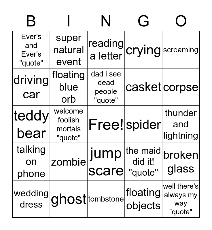This bingo card has a free space and 24 words: zombie, ghost, dad i see dead people "quote", wedding dress, screaming, Ever's and Ever's "quote", driving car, super natural event, spider, jump scare, casket, teddy bear, the maid did it! "quote", broken glass, floating blue orb, floating objects, thunder and lightning, reading a letter, corpse, welcome foolish mortals "quote", well there's always my way "quote", talking on phone, crying and tombstone.