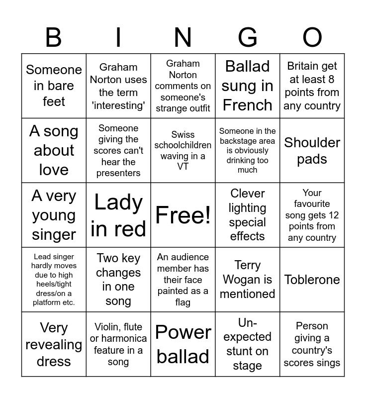 This bingo card has a free space and 29 words: Very revealing dress, Smoke machine, Lady in red, Greece/Cyprus give each other 12 points, Someone in bare feet, Graham Norton comments on someone's strange outfit, Someone giving the scores can't hear the presenters, Two key changes in one song, Clever lighting special effects, Violin, flute or harmonica feature in a song, Your favourite song gets 12 points from any country, Person giving a country's scores sings, Power ballad, Un-expected stunt on stage, Shoulder pads, Your favourite song gets nil points from a country, An audience member has their face painted as a flag, Lead singer hardly moves due to high heels/tight dress/on a platform etc., Britain get at least 8 points from any country, A very young singer, Terry Wogan is mentioned, Handheld props, Someone in the backstage area is obviously drinking too much, A song about love, Ballad sung in French, Graham Norton uses the term 'interesting', Toblerone, Swiss schoolchildren waving in a VT and UK entry looking sad.