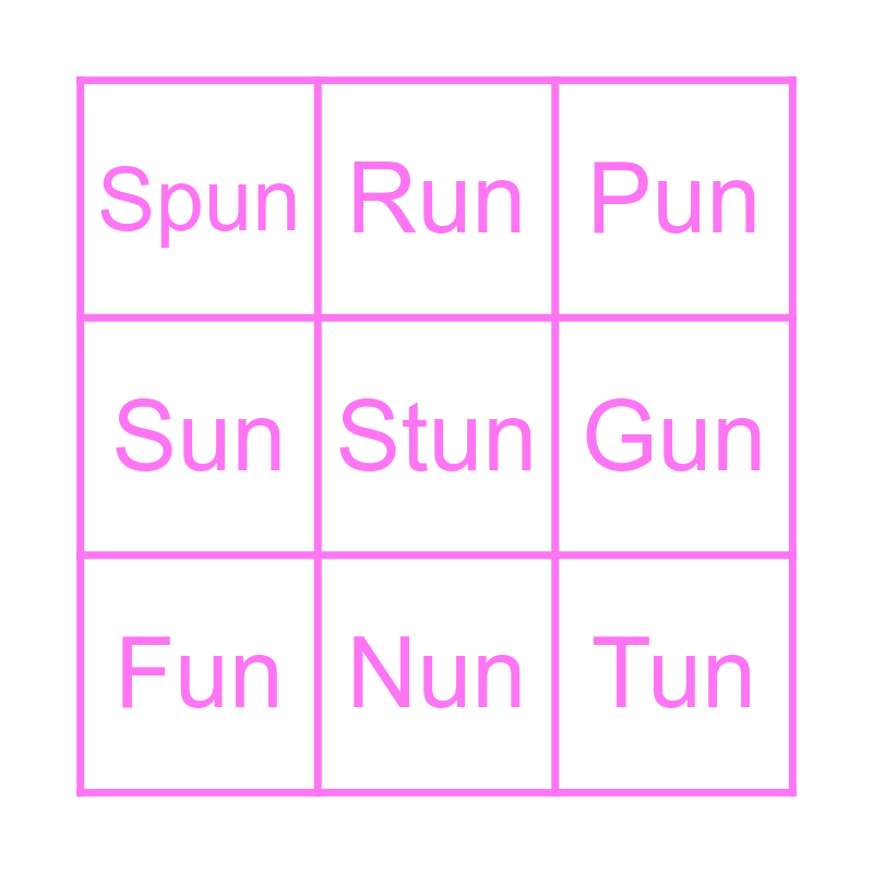 This bingo card has a free space and 8 words: Sun, Run, Gun, Fun, Pun, Spun, Nun and Tun.