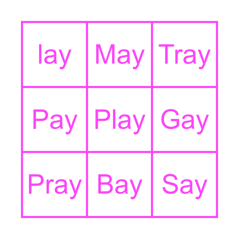 This bingo card has a free space and 8 words: Pay, May, Gay, Pray, Tray, lay, Bay and Say.