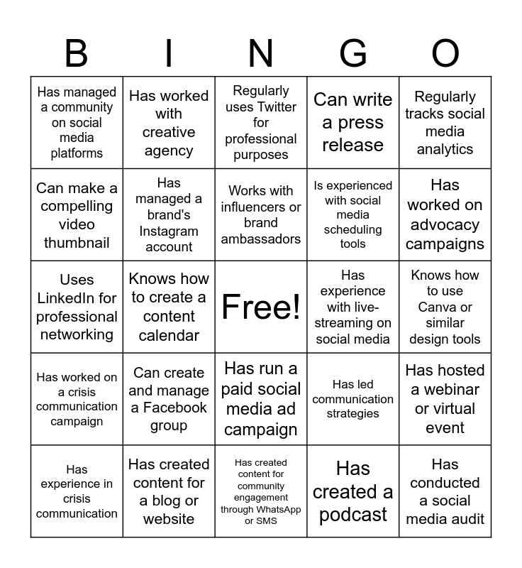 This bingo card has a free space and 40 words: Has written a viral social media post, Uses LinkedIn for professional networking, Knows how to edit a video, Has managed a brand's Instagram account, Has created content for a blog or website, Has run a paid social media ad campaign, Works with influencers or brand ambassadors, Can design graphics for social media, Regularly tracks social media analytics, Has worked on a crisis communication campaign, Knows how to create a content calendar, Can write a press release, Has conducted a social media audit, Knows how to use Canva or similar design tools, Has experience with live-streaming on social media, Can create and manage a Facebook group, Knows how to write SEO-friendly content, Has managed a community on social media platforms, Has done outreach to media for press coverage, Regularly uses Twitter for professional purposes, Has hosted a webinar or virtual event, Has created a podcast, Is experienced with social media scheduling tools, Can make a compelling video thumbnail, Has collaborated with cross-functional teams on social media campaigns, Has written a viral social media post, Knows how to edit a video, Has managed a Org's Social Media Account, Has facilitated workshops or training sessions on communication, Has run a paid social media ad campaign, Works with influencers or brand ambassadors, Has experience in crisis communication, Has written content for donor reports or proposals, Has led communication strategies, Has worked on advocacy campaigns, Has created content for community engagement through WhatsApp or SMS, Has hosted a webinar or virtual event, Has created a podcast, Has worked with creative agency and Has been part of curating an event.