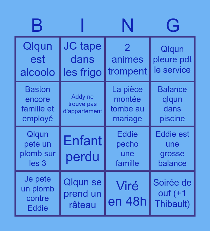 This bingo card has 16 words: Qlqun se prend un râteau, Eddie est une grosse balance, 2 animes trompent, Qlqun est alcoolo, Qlqun pete un plomb sur les 3, JC tape dans les frigo, Eddie pecho une famille, Viré en 48h, Baston encore famille et employé, Addy ne trouve pas d’appartement, Je pete un plomb contre Eddie, Qlqun pleure pdt le service, Enfant perdu, Balance qlqun dans piscine, La pièce montée tombe au mariage and Soirée de ouf (+1 Thibault).