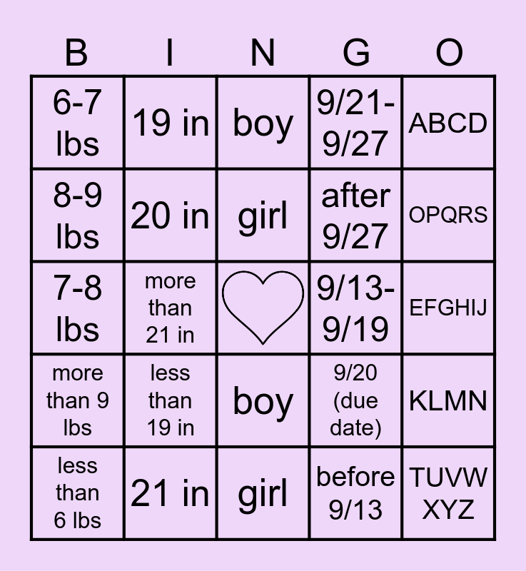 This bingo card has a free space and 24 words: less than 6 lbs, less than 19 in, girl, before 9/13, ABCD, 6-7 lbs, 19 in, boy, 9/13-9/19, EFGHIJ, 7-8 lbs, 20 in, 9/20 (due date), KLMN, 8-9 lbs, 21 in, girl, 9/21-9/27, OPQRS, more than 9 lbs, more than 21 in, boy, after 9/27 and TUVW XYZ.