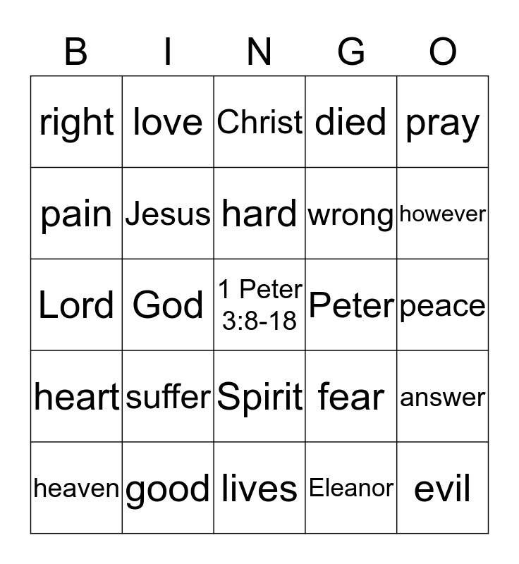 This bingo card has a free space and 24 words: suffer, good, hard, heaven, pray, right, pain, love, Peter, Spirit, wrong, Lord, fear, answer, Jesus, Eleanor, peace, Christ, however, God, evil, heart, died and lives.