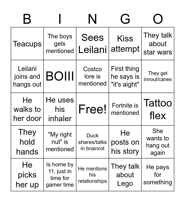 This bingo card has a free space and 24 words: "My right nut" is mentioned, Is home by 11, just in time for gamer time, Costco lore is mentioned, He picks her up, They talk about star wars, Teacups, Leilani joins and hangs out, The boys gets mentioned, Fortnite is mentioned, Duck shares/talks in brainrot, First thing he says is "it's aight", He walks to her door, He posts on his story, She wants to hang out again, BOIII, They talk about Lego, Tattoo flex, Sees Leilani, They get innout/canes, He uses his inhaler, He pays for something, They hold hands, Kiss attempt and He mentions his relationships.