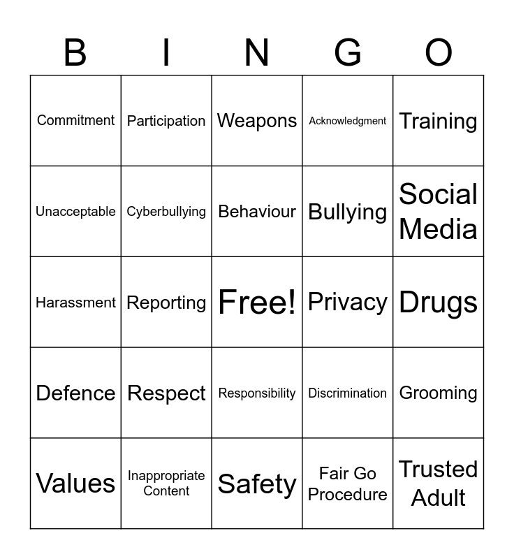 This bingo card has a free space and 25 words: Respect, Safety, Behaviour, Values, Training, Commitment, Unacceptable, Participation, Privacy, Responsibility, Bullying, Harassment, Discrimination, Grooming, Cyberbullying, Alcohol, Drugs, Weapons, Social Media, Reporting, Trusted Adult, Inappropriate Content, Defence, Acknowledgment and Fair Go Procedure.