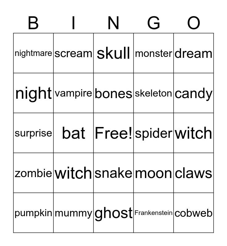 This bingo card has a free space and 25 words: witch, ghost, bones, pumpkin, dream, nightmare, night, scream, spider, snake, skeleton, surprise, moon, claws, vampire, shadow, witch, skull, candy, bat, cobweb, mummy, zombie, monster and Frankenstein.