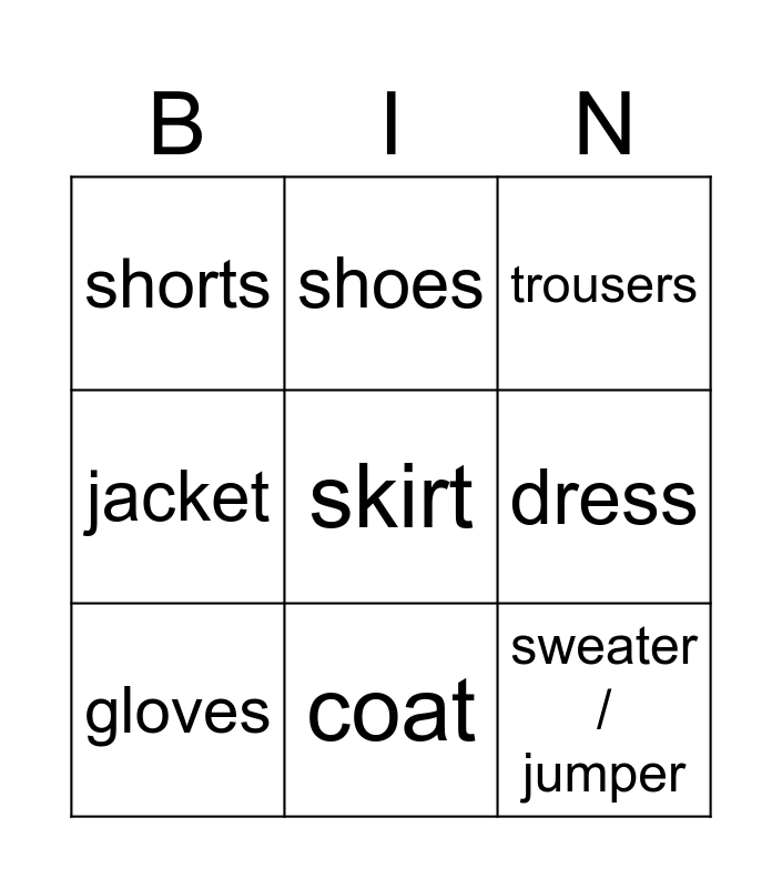 This bingo card has a free space and 16 words: trainers, swimsuit, trousers, shorts, shirt, shoes, T-shirt, sun hat, sweater / jumper, dress, scarf, jacket, jeans, coat, gloves and socks.
