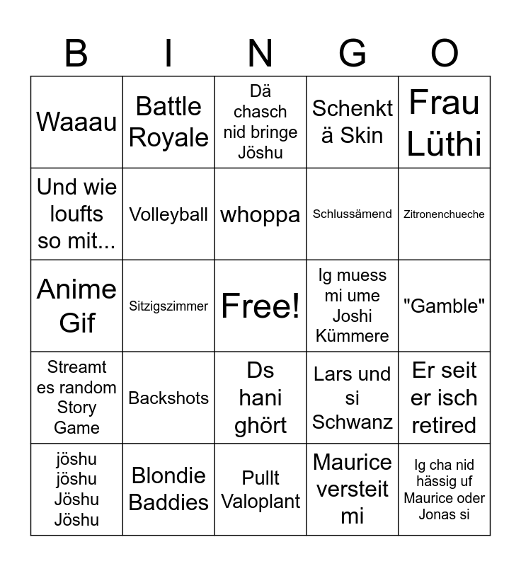 This bingo card has a free space and 24 words: Backshots, Blondie Baddies, whoppa, jöshu jöshu Jöshu Jöshu, Frau Lüthi, Waaau, Und wie loufts so mit..., Battle Royale, Ig muess mi ume Joshi Kümmere, Ds hani ghört, Schlussämend, Anime Gif, Lars und si Schwanz, Er seit er isch retired, Volleyball, Maurice versteit mi, "Gamble", Dä chasch nid bringe Jöshu, Zitronenchueche, Sitzigszimmer, Ig cha nid hässig uf Maurice oder Jonas si, Streamt es random Story Game, Schenkt ä Skin and Pullt Valoplant.