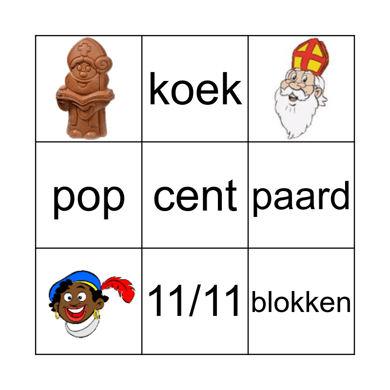 This bingo card has 3 images, a free space and 5 words: paard, koek, blokken, pop and 11/11.