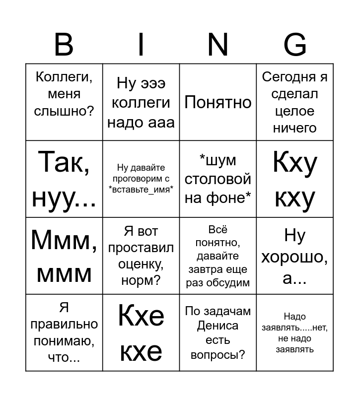 This bingo card has 16 words: Кхе кхе, Ну хорошо, а..., Понятно, Коллеги, меня слышно?, Ммм, ммм, Ну эээ коллеги надо ааа, Всё понятно, давайте завтра еще раз обсудим, По задачам Дениса есть вопросы?, Так, нуу..., Ну давайте проговорим с *вставьте_имя*, Я правильно понимаю, что..., Сегодня я сделал целое ничего, Я вот проставил оценку, норм?, Кху кху, *шум столовой на фоне* and Надо заявлять.....нет, не надо заявлять.