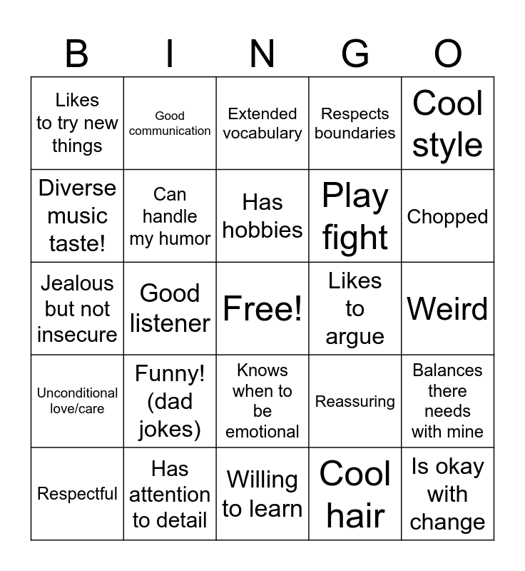 This bingo card has a free space and 24 words: Funny!(dad jokes), Has attention to detail, Has hobbies, Respectful, Cool style, Likes to try new things, Diverse music taste!, Good communication, Likes to argue, Knows when to be emotional, Play fight, Jealous but not insecure, Reassuring, Balances there needs with mine, Can handle my humor, Cool hair, Weird, Extended vocabulary, Chopped, Good listener, Is okay with change, Unconditional love/care, Respects boundaries and Willing to learn.