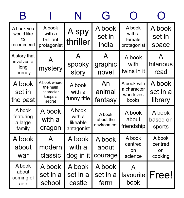 This bingo card has 42 words: A favourite book, A mystery, A book with a one word title, A book with a character who loves books, A book based on sports, A book with a dragon, A book set in the past, A book that became a movie, A spy thriller, A book set in a library, A book with a funny title, A graphic novel, A hilarious read, A book with a female protagonist, A book set in a school, A book featuring a large family, A book centred on cooking, A book with twins in it, Free!, A book with a brilliant protagonist, A book set in space, A book with a dog in it, A book about war, A book you would like to recommend, A wildlife adventure, A book about coming of age, A spooky story, A book with dark humour, A modern classic, A book centred on science, A book about a secret society, An animal fantasy, A story that involves a long journey, A book about friendship, A book set in a castle, A book with a likeable antagonist, A book about the environment, A book where the main character keeps a secret, A book about courage, A book set in a farm, A book set in India and A book where a wish comes true.