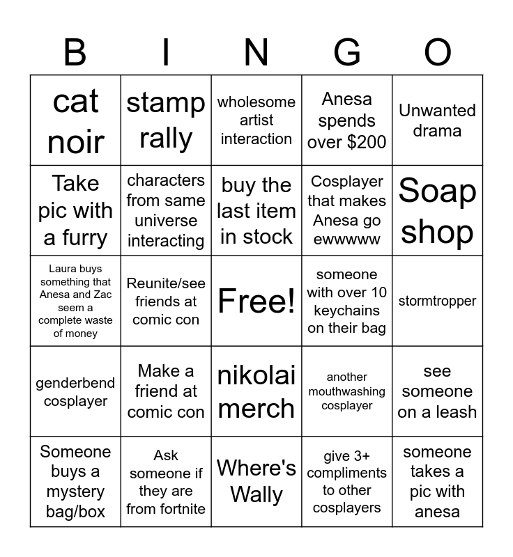 This bingo card has a free space and 24 words: Make a friend at comic con, Ask someone if they are from fortnite, buy the last item in stock, Someone buys a mystery bag/box, Unwanted drama, cat noir, Take pic with a furry, stamp rally, someone with over 10 keychains on their bag, nikolai merch, Cosplayer that makes Anesa go ewwwww, Laura buys something that Anesa and Zac seem a complete waste of money, another mouthwashing cosplayer, see someone on a leash, characters from same universe interacting, give 3+ compliments to other cosplayers, stormtropper, wholesome artist interaction, Soap shop, Reunite/see friends at comic con, someone takes a pic with anesa, genderbend cosplayer, Anesa spends over $200 and Where's Wally.