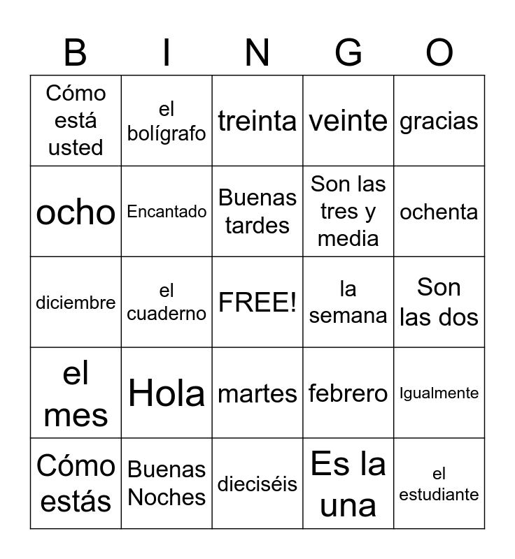 This bingo card has a free space and 24 words: Hola, Buenas Noches, Buenas tardes, Cómo estás, gracias, Cómo está usted, ocho, el bolígrafo, la semana, martes, Son las tres y media, diciembre, febrero, Igualmente, Encantado, Es la una, Son las dos, treinta, ochenta, el cuaderno, el estudiante, el mes, veinte and dieciséis.